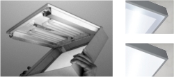 Two-piece luminaire housing made of sheet-steel with luminaire cover (removable without tools) made of crisp-edged drawn aluminium profile. Mitred and joined. With permanently fitted diffuser made of highly dispersing, translucent acrylic. The plastic surface is satin-matt opal.