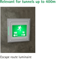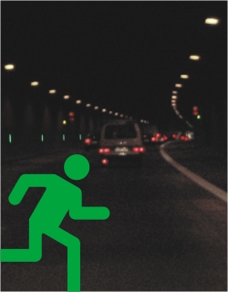 In addition to prevention (i.e. the avoidance of hazards and accidents in tunnels), the new version of the RABT directive gives increasing prominence to personal safety. Top priority here is given to enabling road users to rescue themselves. In the event of an accident, people located in a tunnel should be able to get themselves to safety without having to wait for the arrival of rescue services. In addition to the precautionary constructional measures, comprehensive protection of tunnel users is provided by a tunnel-specific surveillance and operating system and a complex safety system. In the tunnel, the relevant escape routes and emergency exits are signposted. Emergency exits are located at a minimum spacing of 300 metres. The escape routes are equipped with permanently lit, self-illuminated emergency signs and with orientation luminaires of high brightness, spaced at about every 25 metres, which only come on in the event of fire and which direct to the nearest emergency exits. |
